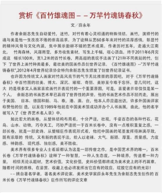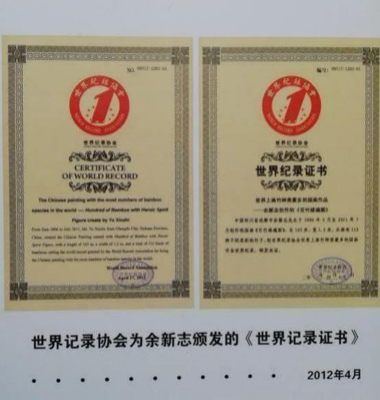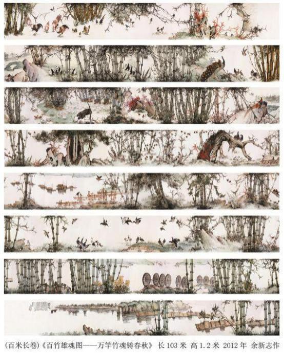 余新志,石竹斋书画院院长,中国沫若书画院终身院长, 徐悲鸿画院艺术顾问,联合国教科文组织名誉主席,国际书画家协会常务主席,中国陶行 知教育基金会艺术总监,西南交通大学客座教授等百余职。 1989 年就在中国美术馆成功举办个人书画展,声震画坛, 享誉海内外。2007 年应邀参加外蒙古国“纪念成吉思汗成 立 800 周年”大型活动,被授予“成吉思汗”荣誉勋章;2010 年被世界华人华侨总会评为“世界华人精英优秀人物”和“世 界华人杰出艺术家”;2011 年被国家授予“共和国杰出书画 家”勋章;2014 年被授予“全国‘五·一’劳模”勋章;2015 年被评为“非物质文化遗产传承人物”,授予“一代宗师” 荣誉称号。2017 年在美国洛杉矶举办画展,受邀走进联合 国会议大厅参加高峰论坛会,受到布鲁斯·罗茨主席的亲切 接并合影留念。2021 年余新志先生与张大千、林散之、李 苦禅、林凤眠、启功、李可染、欧阳中石、黄永玉、沈鹏等 顶尖级艺术家被评为“艺术百年·新中国十大巅峰艺术家”。 余老先生几十年来,走遍大江南北,全身心投入竹画写生创 作,收集素材数千幅,终于在 2012 年创作完成了长 103 米、宽 1.2 米的百米长卷《百竹雄魂图——万竿竹魂铸春 秋》,创下“画竹种类最多、最美的百米长卷”世界纪录, 传承千秋。2016 年百米长卷又被载入《中国国史》,为世 人留下了不朽的竹画史料、宝贵财富,永载史册。2024 年经国家艺术档案馆严格审评授予余新志为《中国四大国粹传 承人》,并颁发荣誉证书。2024 年 7 月授予《中国书画百 年巨匠传人》颁发荣誉锦旗、荣誉证书。从 1993 年以来, 中国邮政总局先后为余新志先生出版珍藏纪念邮票三十余 套,全球发行,传播文化。并先后出版发行余新志个人专著 画集数百套。上百幅作品被国家博物馆、中国美术馆等国内 外几百家艺术藏馆永久收藏陈列。其个人传略被载入《中国 人物年鉴》《中国国史》《中国历代美术家名人大辞典》《世 界人物辞海》等百余部辞书。余新志先生倾尽毕生心血,为 弘扬中华民族优秀的传统文化作出了杰出贡献。
