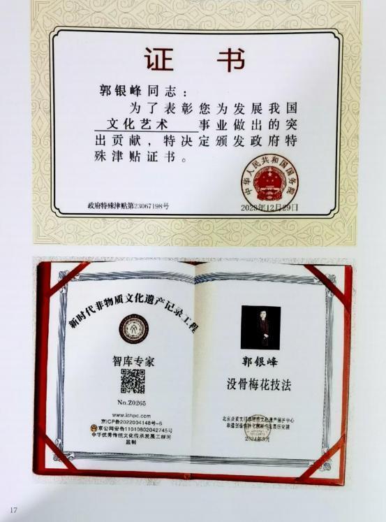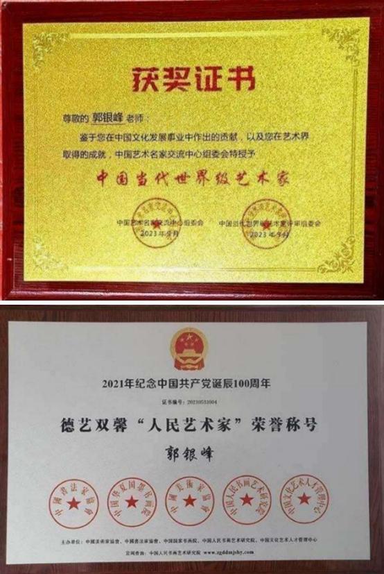 郭银峰,1949 年生于甘肃庆阳。1968 年参军,先后在西藏军区、成都军区、 解放军西安第二炮兵工程学院、解放军 西安政治学院工作,正团职,上校军衔。1994 年转业后供职于陕西省人大办公厅,任厅级巡视员。郭银峰作品油画《放学 以后》获 1988 年全国书画展一等奖。国画《黄河颂歌》获 2002 年韩国国际书画大赛最高奖“国际功勋奖”。国画《梅 花寒香图》2009 年获全国国画展一等奖。国画《我的同学》获 2010年全国第十四届大地之歌书画展一等奖。2012 年在北京人民大会堂举办个人书画作品展览及 高层艺术研讨会。2012 年,郭银峰在法 国卢浮宫举办书画展,受到国际友人高 度评价。现为亚洲书画家协会副主席,胡润国际书画艺术鉴定中心副主席,全 国书画艺术委员会副主席,中央美院客 座教授,中国国家高级美术师,国家特 级书法师,西北书画研究院院长,英国牛津艺术学院客座教授博士生导师,陕西省人民政府参事室文史馆研究员,亚洲博鳌艺术中心研究员。2021年分别被授予“祖国优秀艺术家”“书画艺术楷模”建党一百年被授予“德艺双馨人民艺术家”荣誉称号,“世界文化艺术形象大师”“中国国家艺术形象代表人物”“中国功勋人物”等荣誉称号。2022 年被特邀成为沈鹏书法艺术工作室专家组高级理事。重点推荐为“中国艺术大家”“人民书画家”“华夏儿女优秀艺术传承之星”“党旗下的艺术大家”称号。授予郭银峰“2023 年度全球十大杰出风云人物”,“中国艺坛 2023 年度优秀艺术家”,“威尼斯双年展——特别推荐艺术家”,文化和旅游部授予“优秀书画导师”,“中国当代世界级艺术家”,“一带一路文化形象大使”“中国国礼特供艺术家”。2024 年入编大红袍合集书、荣获共和国勋章、被授予“毕加索”国际艺术功勋人物、被授予诺贝尔奖。